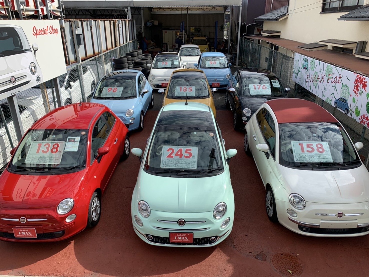フィアット500の専用展示場が完成しました。在庫も徐々に増えてきて、個性的なチンクエチェントが集まっています。【I-MAX-Fiat】としても専門店を語れる環境が整ってきました。エンジン音、マフラー音の比較、グレードや装備の違いなど、現車で確かめることができます。また、ご予約いただければ、試乗することもできますので、お気軽に082-507-5255まで、お電話ください。